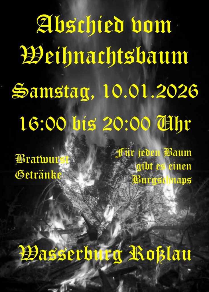 Das alte Jahr ist vorbei und wir beginnen das neue mit unserem traditionellen „Abschied vom Weihnachtsbaum“ am 10.01. auf dem Burggelände.